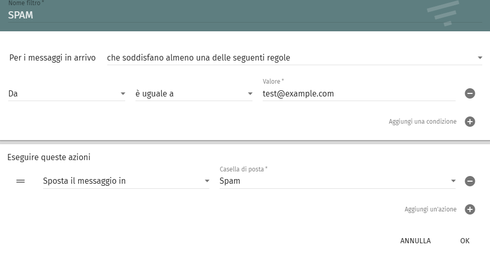 Come esempio, creeremo un filtro che sposta i messaggi nella cartella Spam: