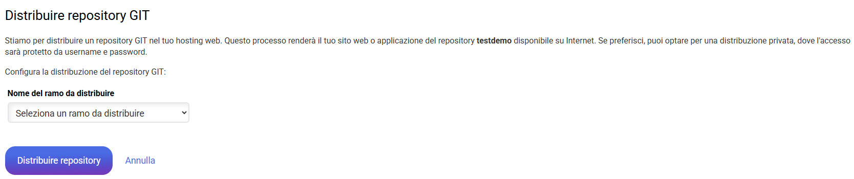 Distribuire il repository GIT:La seconda icona è quella di distribuire il repository. Selezionandolo, è possibile scegliere il ramo che si desidera distribuire. Per impostazione predefinita, solo il ramo principale ("principale") sarà disponibile fino a quando non si creano altri rami utilizzando Git.
