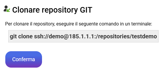 Clone GIT repository:La prima icona consente di clonare il repository. Quando si fa clic, apparirà un comando che sarà necessario copiare ed eseguire sul terminale per clonare il repository sulla macchina locale.