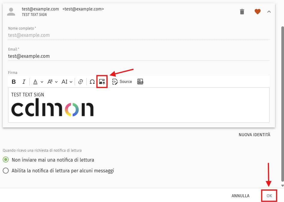NOTA: Alcuni client di webmail (come Gmail, Outlook, ecc.) potrebbero mostrare errori visivi con l’immagine allegata. In alternativa, puoi usare l’opzione HTML editor di SOGo e inserire l’immagine tramite un URL pubblico (ad esempio: https://tuodominio.com/logo.png). Questo garantisce che formato e dimensione rimangano uniformi quando invii l’email.