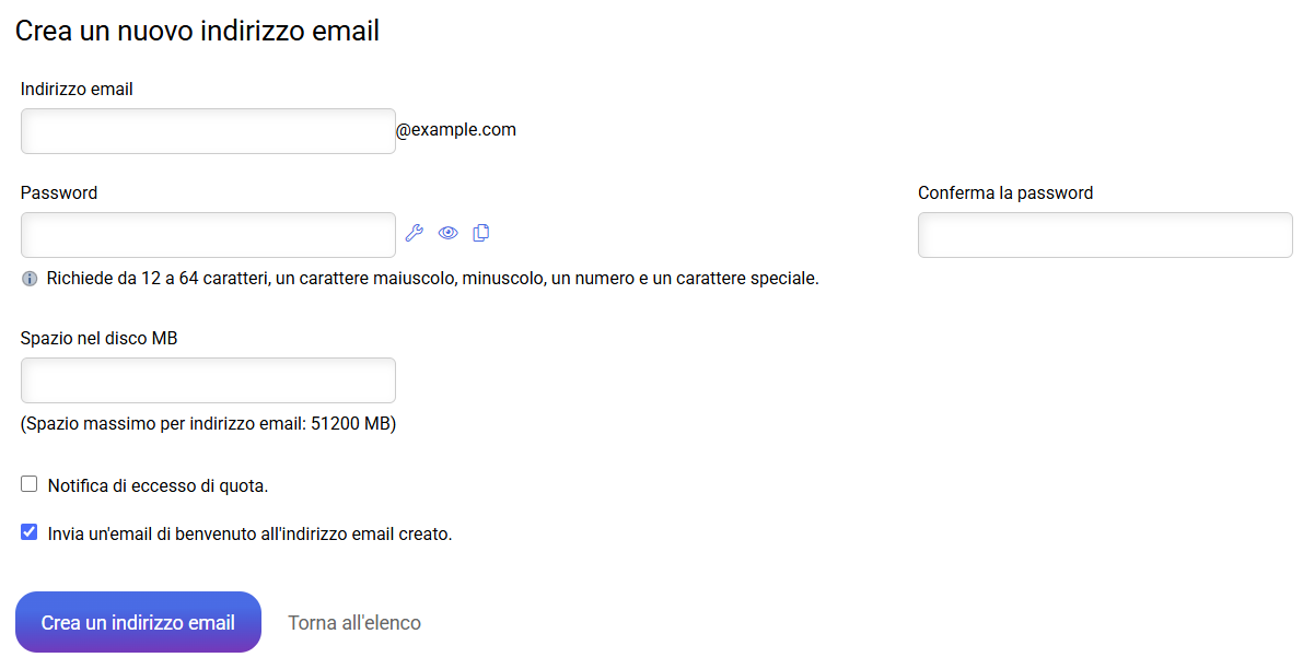 - Scegli una password da associare a questo account e memorizzala, poiché ti servirà in futuro per accedere a Webmail SOGo o per configurarla in un client di posta come Mail di Mac, Outlook, ecc.
