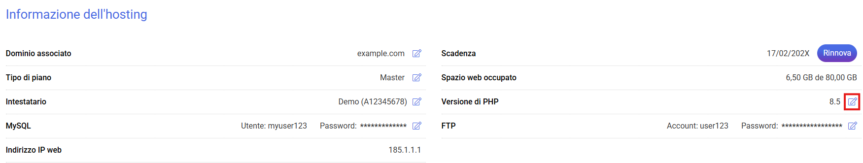 Accedi alla gestione dell’hosting che desideri modificare. Nella parte superiore, nella sezione Informazioni dell’hosting,