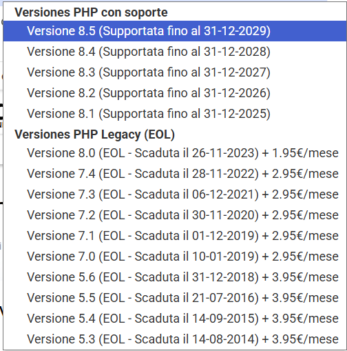 Tieni presente che le versioni PHP senza supporto ufficiale (EOL) sono ora gestite tramite il