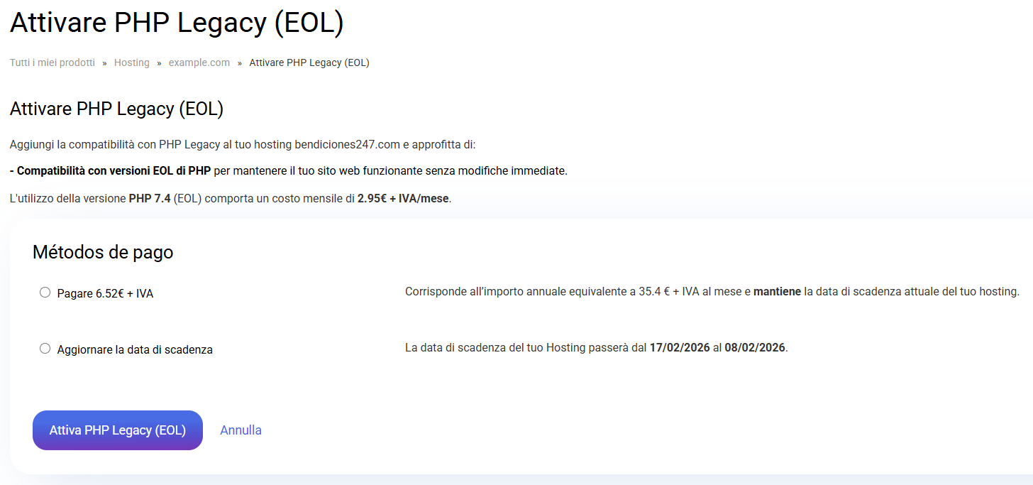 4. Opzioni di pagamento e attivazione di PHP Legacy