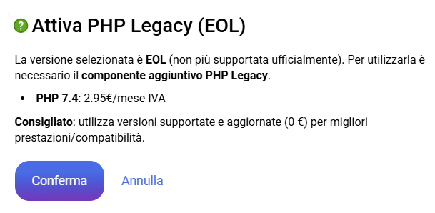 Se selezioni una versione PHP Legacy, verrà mostrato un avviso che indica che la versione è EOL e che, per utilizzarla, è necessario attivare il componente aggiuntivo PHP Legacy, insieme al relativo costo mensile.