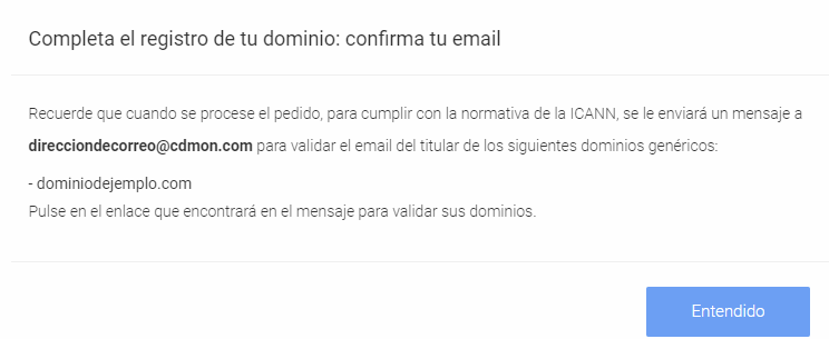 Per concludere, verrà mostrata una finestra che indica l’invio di un’email all’indirizzo del titolare del dominio per convalidare l’acquisto. Dovrai accedere a quell’indirizzo email e accettare il messaggio ricevuto. È importante notare che questa finestra non compare sempre: dipende dall’estensione del dominio registrato.