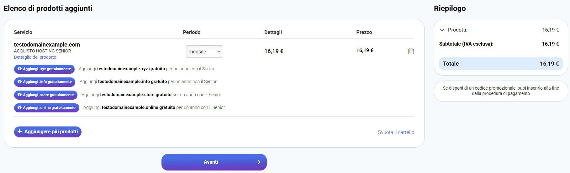 Facendo clic su questo pulsante verrai reindirizzato al carrello del nostro sito. Qui potrai verificare che l’hosting sia stato aggiunto correttamente e procedere al pagamento per completare la contrattazione.