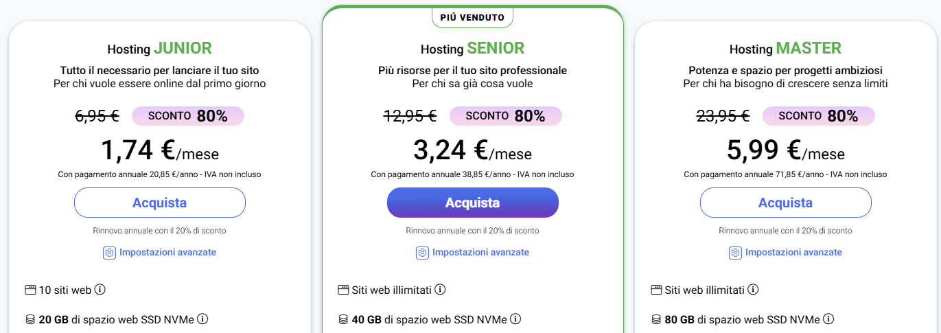 Scalabilità: Man mano che il tuo sito cresce, hai sempre la possibilità di passare a un piano superiore per disporre delle risorse necessarie.