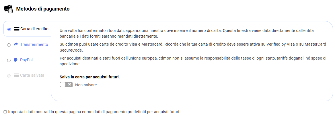 In questa stessa schermata dovrai selezionare il metodo di pagamento desiderato tra bonifico/trasferimento, carta Visa/MasterCard, addebito diretto o PayPal:
