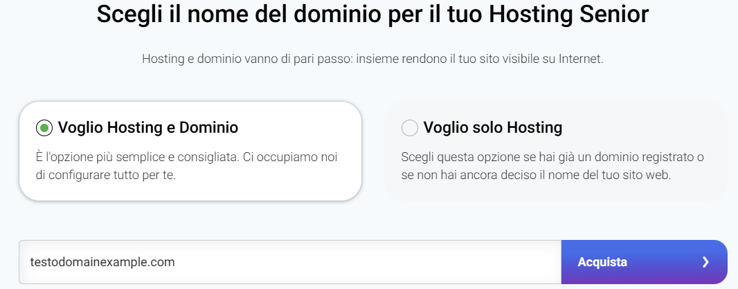 Dopo aver inserito il nome del dominio da associare all’hosting, fai clic su “Contratta hosting e dominio”.