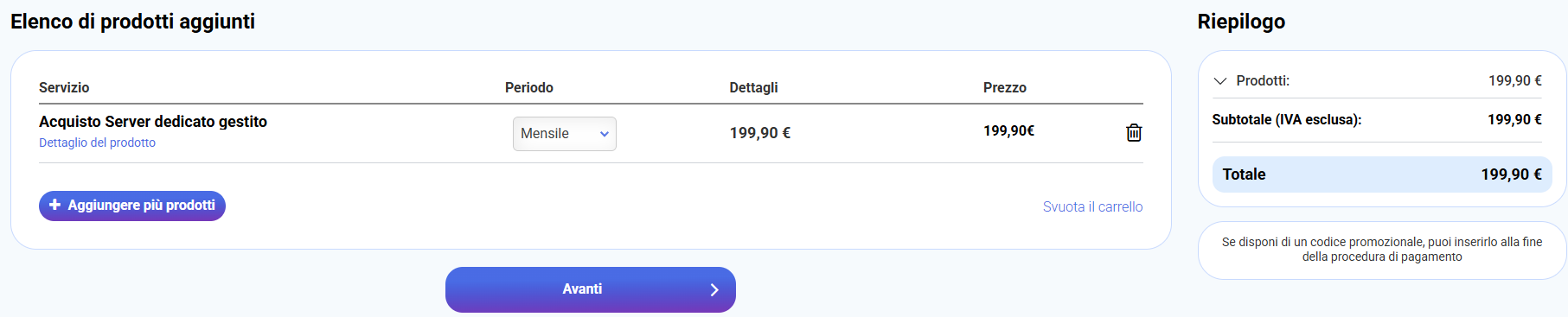Facendo clic su questo pulsante verrai reindirizzato al carrello del nostro sito. Qui potrai verificare che il Server Dedicato sia stato aggiunto correttamente e procedere al pagamento per completare la contrattazione.
