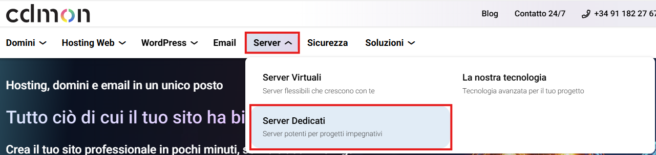 Il primo passo per attivare un Server Dedicato con noi è accedere alla nostra pagina commerciale cdmon.com. Da questa pagina puoi consultare tutte le informazioni necessarie sui nostri prodotti e su cdmon. Per attivare il nuovo server, devi andare nella parte superiore sinistra, nella sezione “Server” e accedere a “Server Dedicati”: