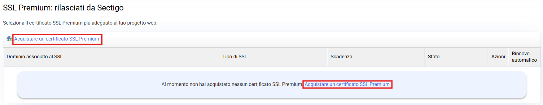 Se desideri un certificato Premium, nella stessa schermata devi fare clic sull’opzione Richiedi un certificato SSL Premium.