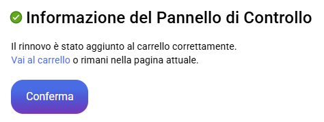 3.- Facendo clic sull’opzione “Rinnova”, comparirà il seguente messaggio: dovrai fare clic su vai al carrello per continuare con il processo di rinnovo o riattivazione dell’hosting.
