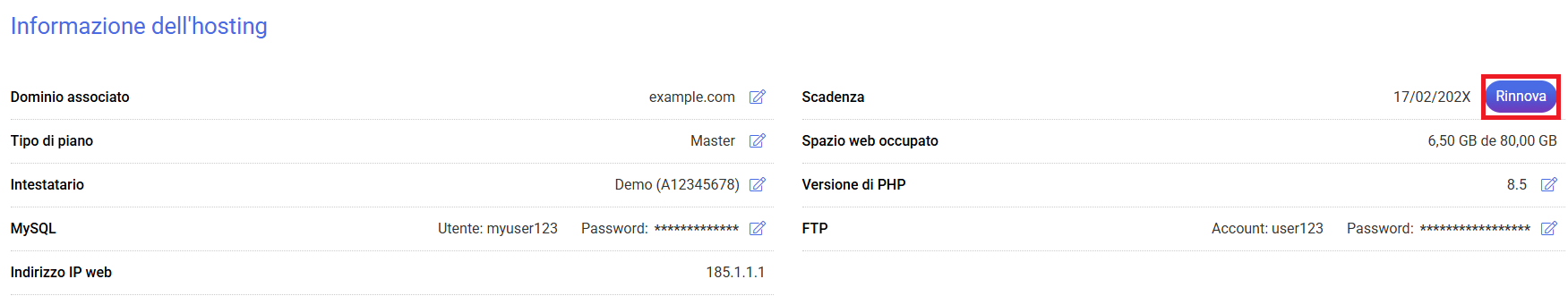 2.- Nella schermata di gestione dell’hosting puoi visualizzare la sezione “Informazioni sull’hosting”, dove troverai i dati di base del tuo servizio, come nome del dominio, tipo di piano, intestatario, ecc. In questa sezione devi fare clic sull’opzione Rinnova nel campo “Scadenza”.