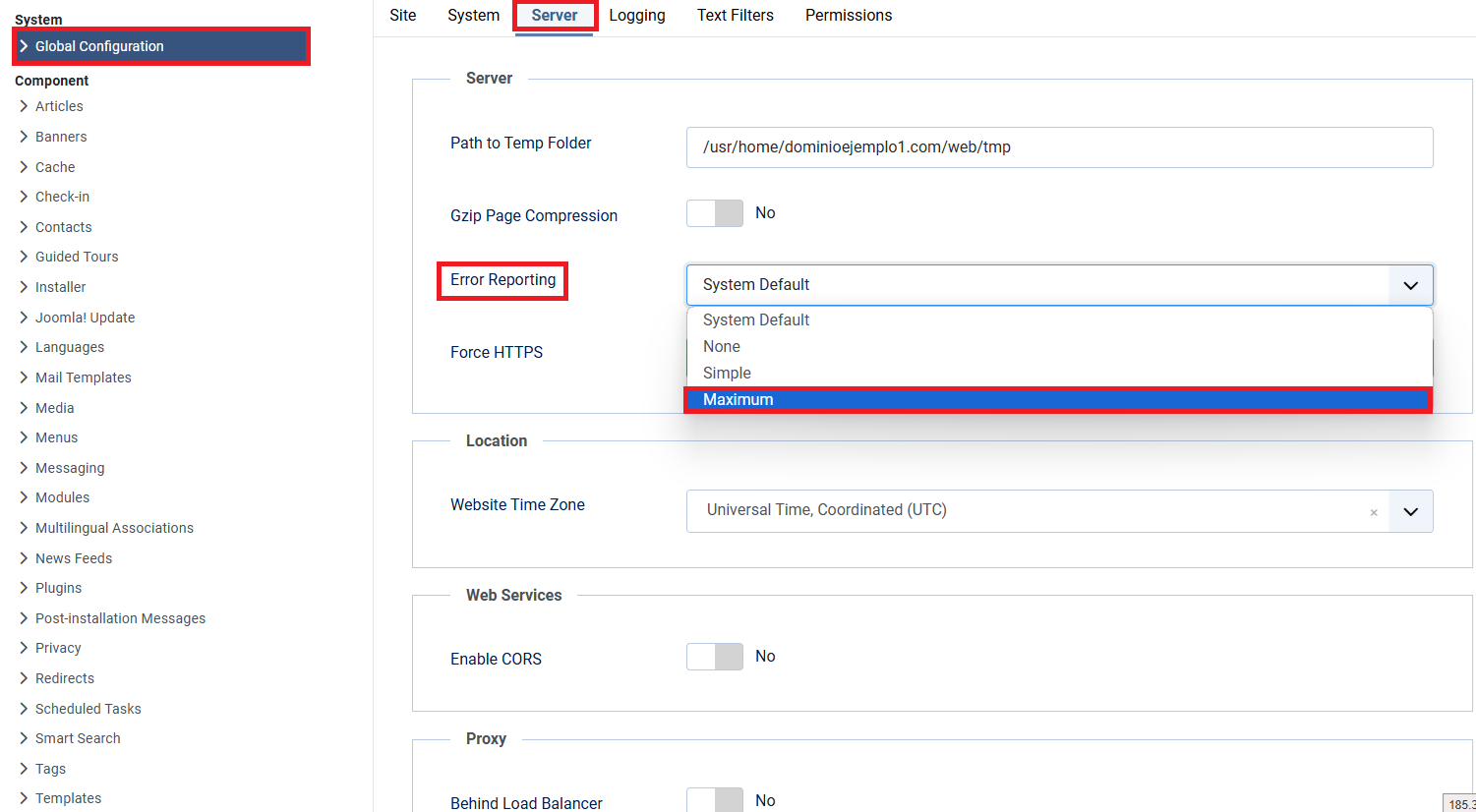 Possiamo attivare i messaggi di errore accedendo all’amministrazione di Joomla, in Configurazione Globale → Server e, in Segnalazione errori, selezioniamo Massimo.
