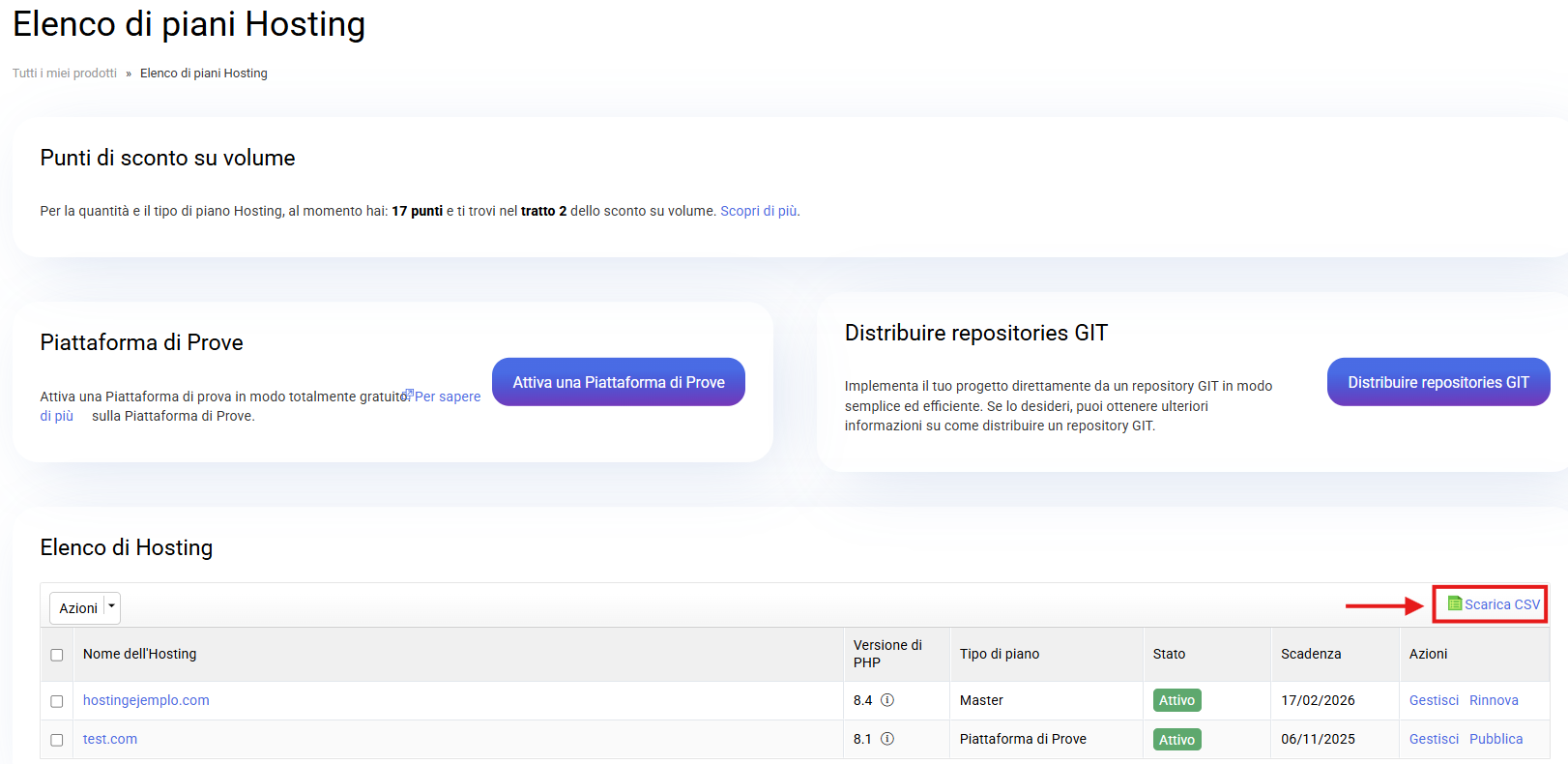 Una volta lì, nella sezione destra dell’Elenco degli Hosting, devi fare clic su Scarica CSV per ottenere il file.Il file verrà scaricato sul tuo dispositivo. Il nome del file corrisponde alla data di generazione.