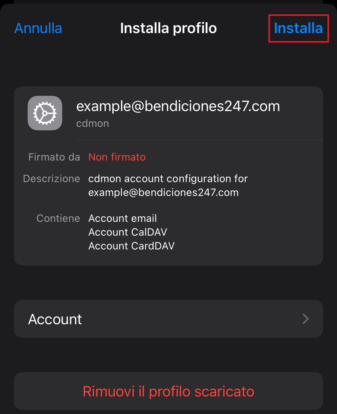 - Vedrai un messaggio che indica “Profilo installato” e il tuo account sarà completamente configurato.