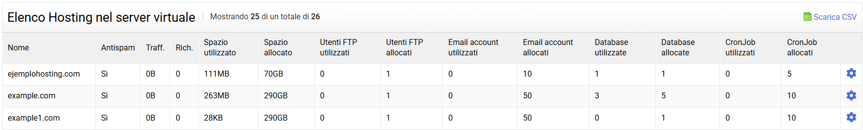 Infine, potrai scaricare in formato CSV l'elenco degli hosting creati sul server Virtuale Up.
