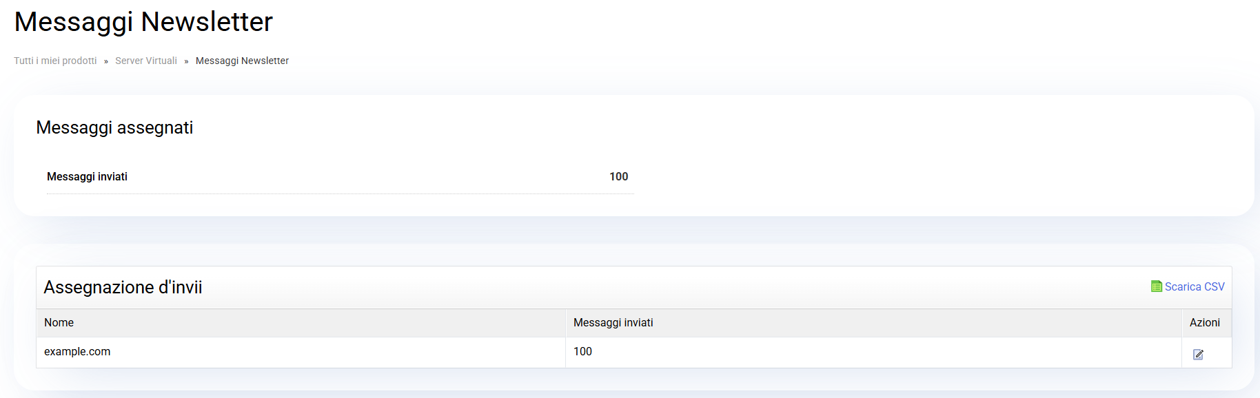 Verrà visualizzato l’elenco degli hosting a cui hai assegnato gli invii con l’utente newsletter. Con l’icona a destra puoi modificare il numero di invii.