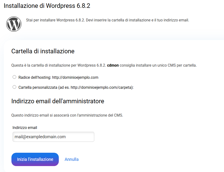 Se si seleziona il Radice di hosting, verrà installato nella cartella /web e sarà accessibile direttamente dal dominio principale.