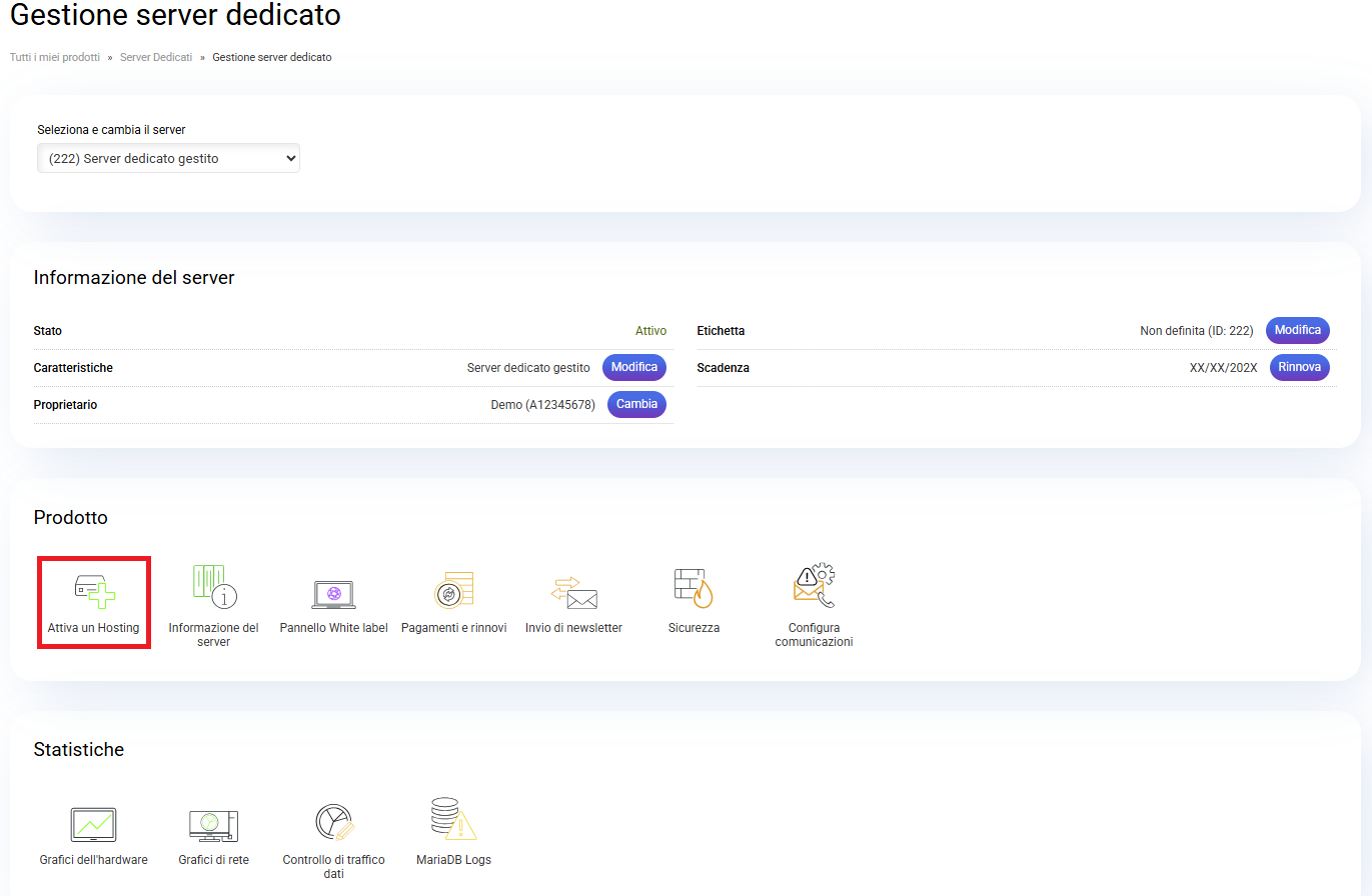 Creare hosting- Questa sezione assegna dati dal nuovo hosting