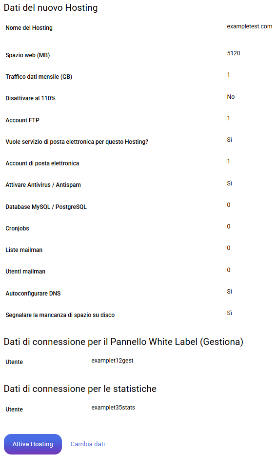 Dati di collegamento per il nuovo alloggio -L'utente e la password dei vari servizi verranno generati automaticamente, modificati da quelli desiderati.