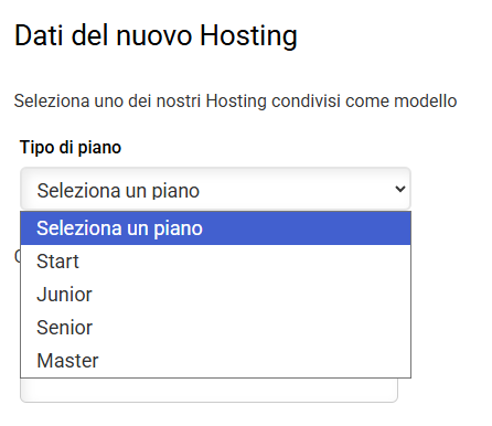 - Tipo di piano:È possibile selezionare uno qualsiasi dei nostri piani di hosting e le funzionalità di esso verranno assegnate automaticamente. È un modello con caratteristiche:
