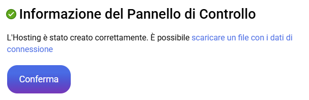 Apparirà una finestra come la seguente per confermare la registrazione dell'hosting. Da qui puoi scaricare un CSV con i dati di connessione (sono mostrati solo gli username; le password sono nascoste per sicurezza).