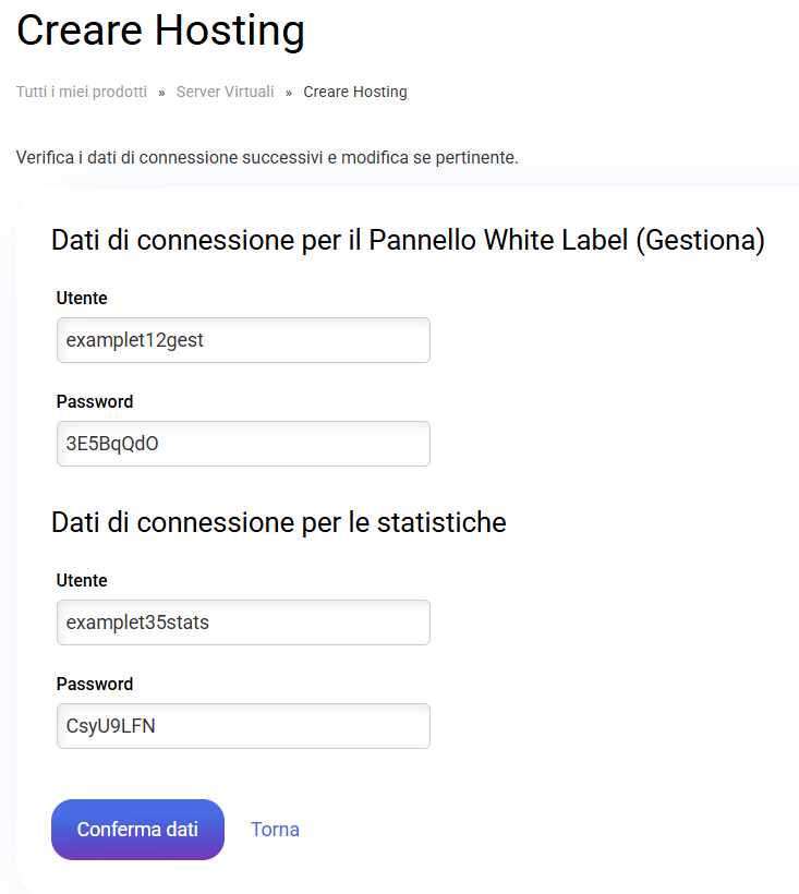 - Dati di connessione per il pannello White Label Gestiona: Dati di accesso per il pannello di controllo dell'hosting. Questo pannello è white-label e accessibile tramite www.hosted-domain.com/pcontrol.