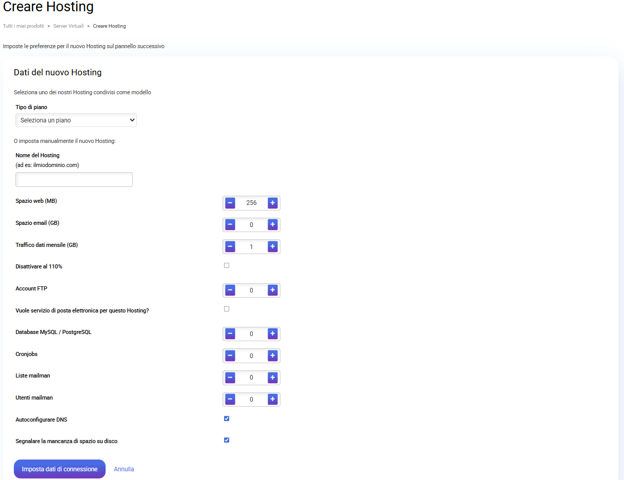 - Tipo di piano: Puoi selezionare uno qualsiasi dei nostri piani di Hosting e le caratteristiche verranno assegnate automaticamente. È un modello con le seguenti caratteristiche: