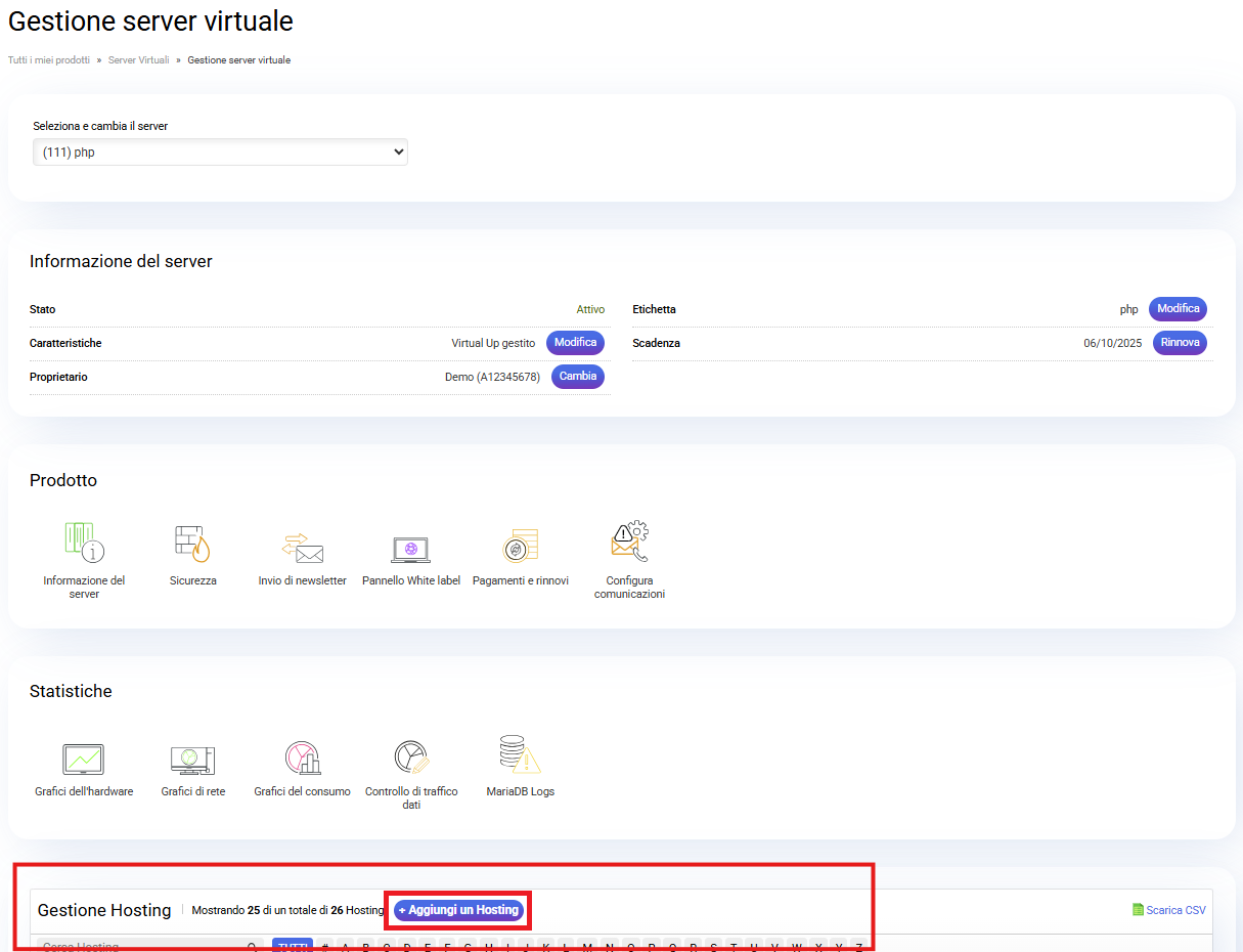 Una volta nella schermata "Gestisci server virtuale", clicca sull'opzione +Aggiungi Hosting, che aprirà un modulo per creare l'hosting web distribuendo le risorse disponibili.