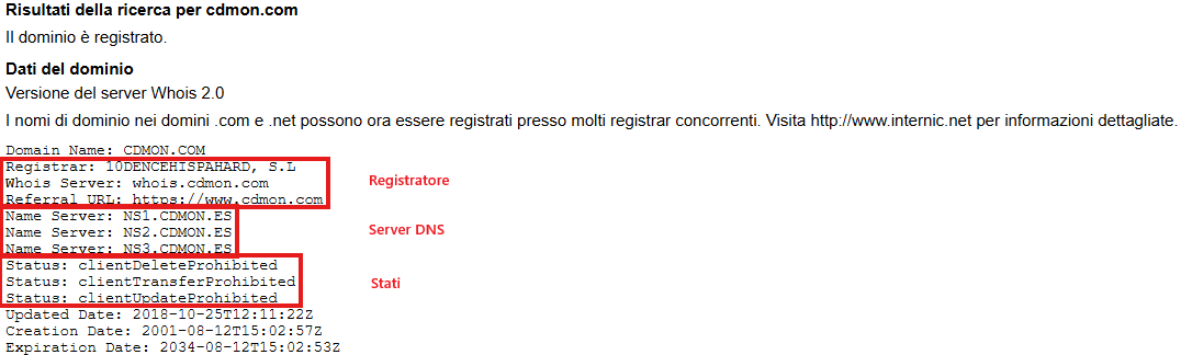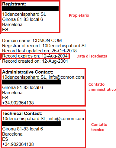 Questo database (whois) può essere consultato in qualsiasi momento per verificare i dati di registrazione. Tra le altre informazioni, troveremo: