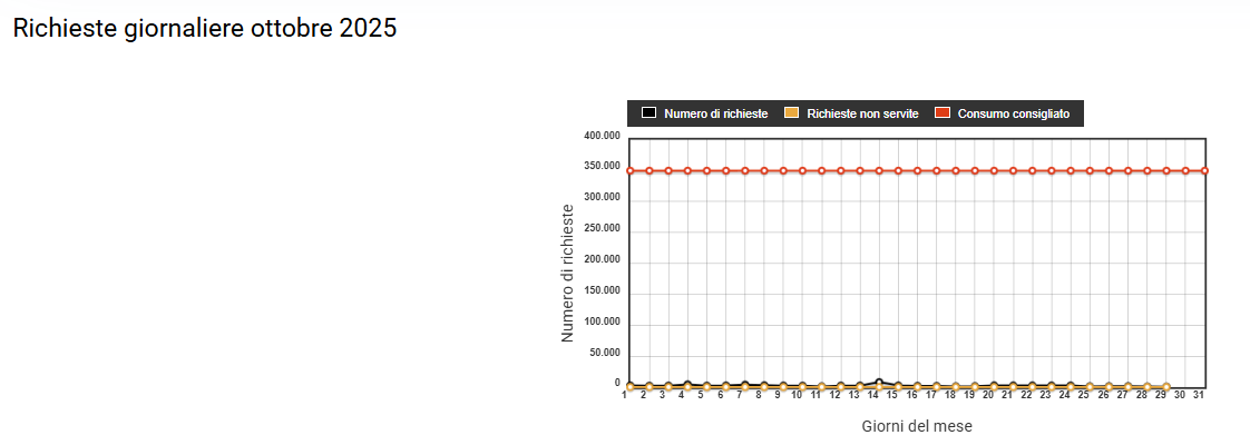 Attraverso il seguente grafico puoi visualizzare il numero di richieste giornaliere generate dal tuo hosting web. Tali richieste sono la somma di quelle generate dalle visite, dai bot dei motori di ricerca e dalle pagine di errore. Viene mostrato il valore giornaliero generato e, come limite, il numero di richieste giornaliere consigliate dal piano. Se desideri visualizzare mesi precedenti, utilizza i selettori e poi premi il pulsante Carica. Puoi trovare maggiori informazioni su cosa sia una richiesta nella pagina di supporto Controllo del consumo dell’hosting web. Le richieste non servite corrispondono a quelle che non hanno potuto essere elaborate perché l’hosting ha raggiunto il limite massimo consentito dal sistema. Questo tipo di richieste appare generalmente per due cause principali: la prima è un aumento reale delle visite giornaliere, dovuto al successo del sito web; la seconda può essere causata da visite puntuali di diversi bot dei motori di ricerca che generano un carico extra sul sito e fanno raggiungere i limiti.