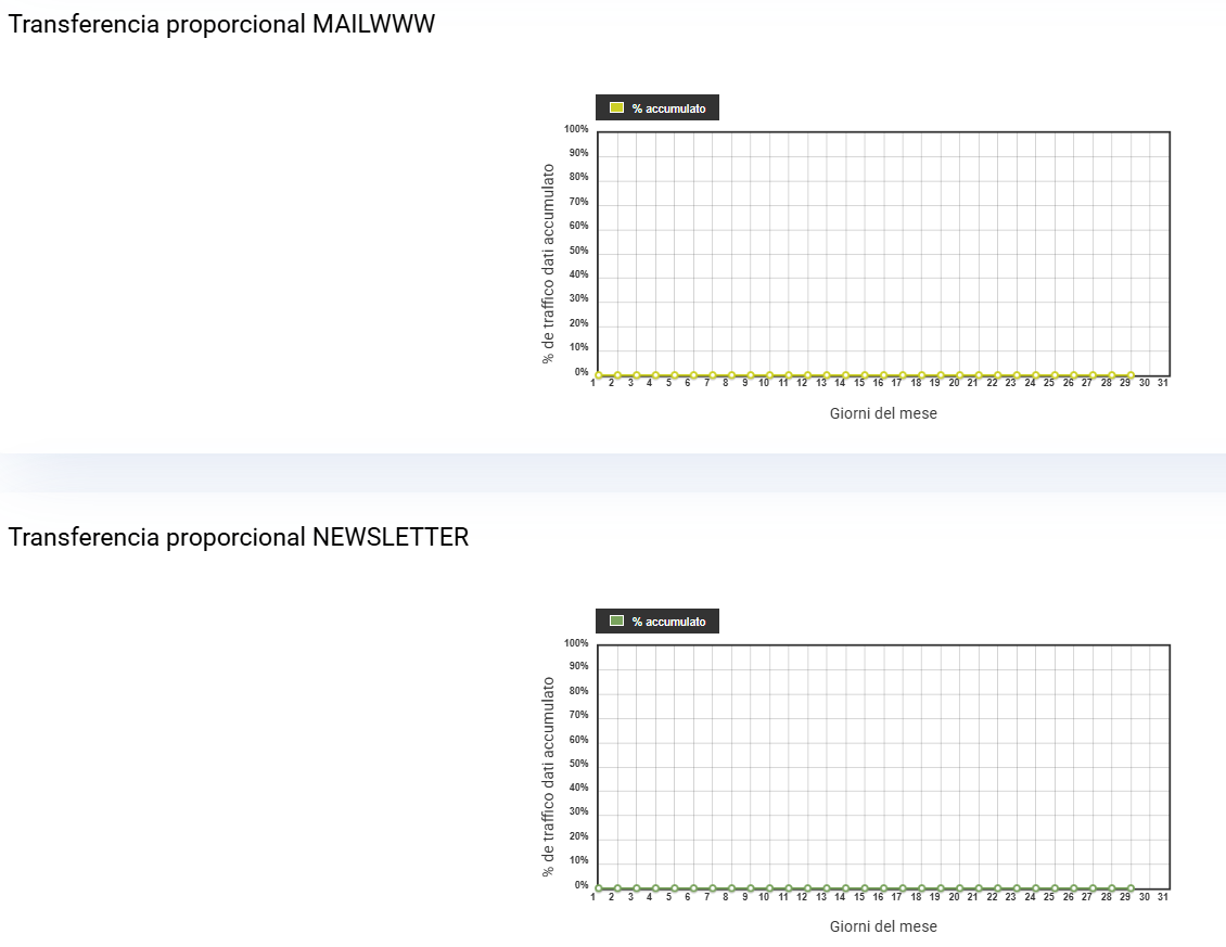 In questa sezione puoi visualizzare i grafici di consumo generati dalla posta suddivisi in varie parti: traffico generato dalla consultazione e dal download tramite POP e IMAP, traffico generato dalla webmail, traffico generato dall’Utente newsletter e dall’applicazione Mailman, oltre al traffico generato dagli invii tramite SMTP.