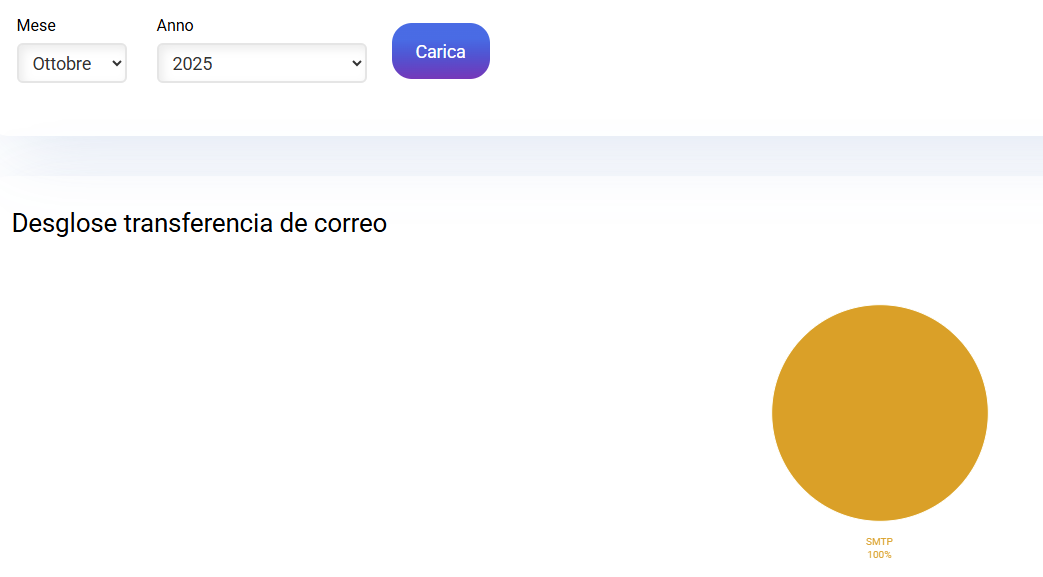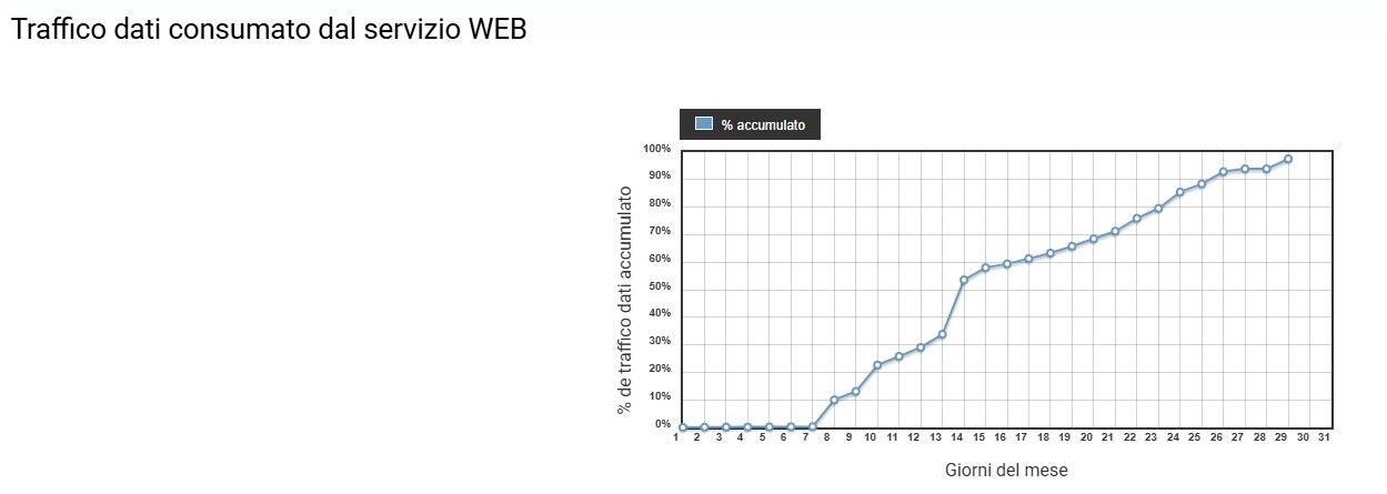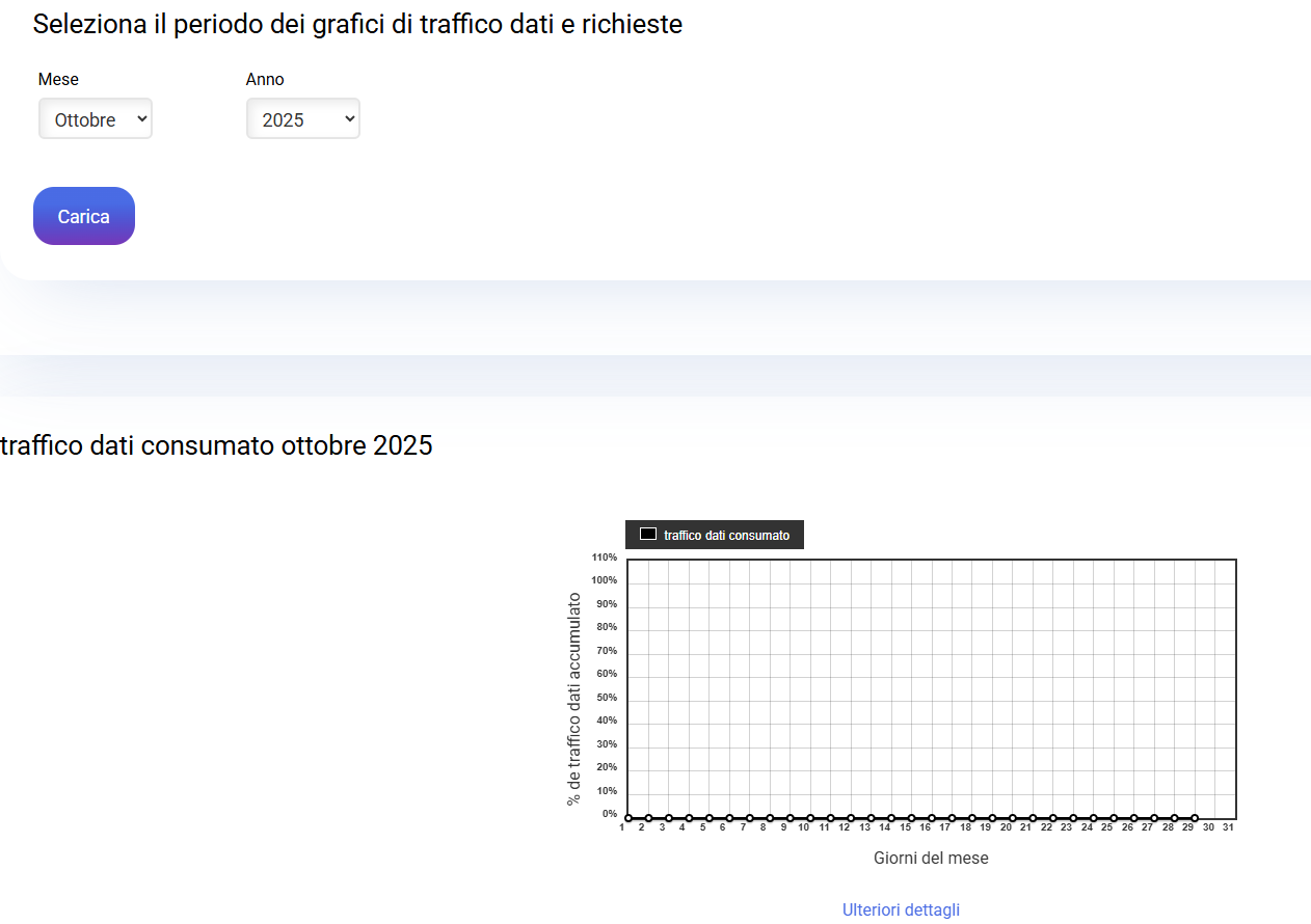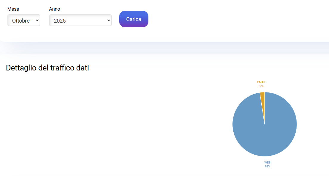 Attraverso il seguente grafico puoi visualizzare il volume di traffico consumato ogni giorno. Viene mostrato un totale giornaliero e, come limite, il 100% del traffico contrattato. Se desideri visualizzare mesi precedenti, puoi utilizzare i selettori e successivamente premere il pulsante Carica.