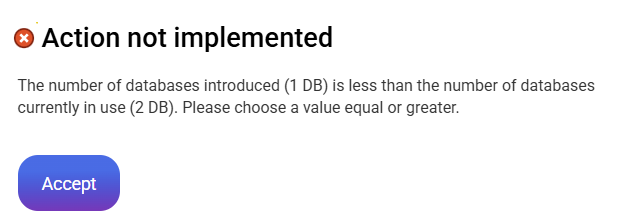 Quando si tenta di modificare le caratteristiche dell’hosting, in particolare riducendo il piano, può verificarsi un errore relativo a database o multidomini/alias creati nell’hosting. Prima di apportare modifiche, assicurati di eliminare manualmente queste funzionalità affinché siano compatibili con le caratteristiche del nuovo piano che desideri associare.