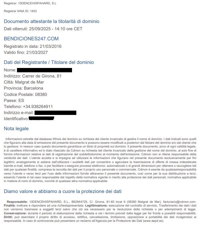 Cliccando su tale opzione scaricherà un documento come quello che vedrai di seguito, con i dati nel database Whois al momento dell'emissione del documento, e in cui potrai vedere il registro, la data.