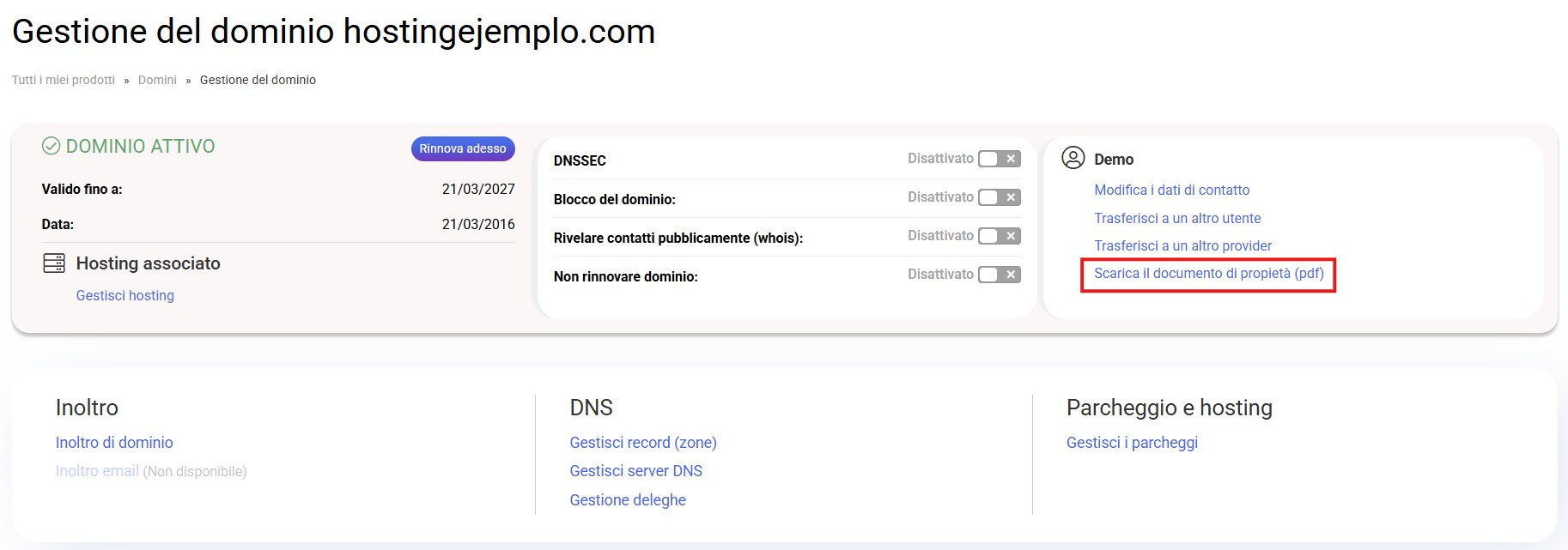 Nella schermata di gestione del dominio fare clic sull'opzione Scarica il documento del titolo (pdf).