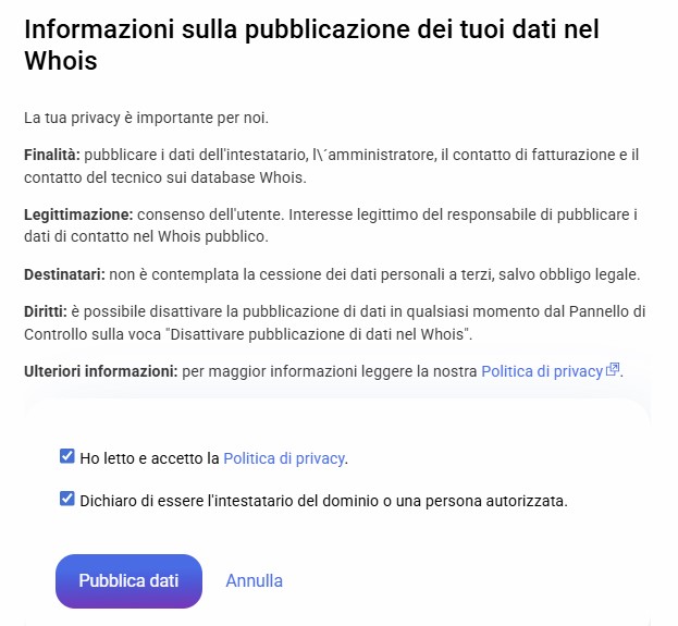 Quando si attiva l'opzione "Pubblica dati nel Whois" è necessario accettare i termini per la pubblicazione dei dati nel Whois.