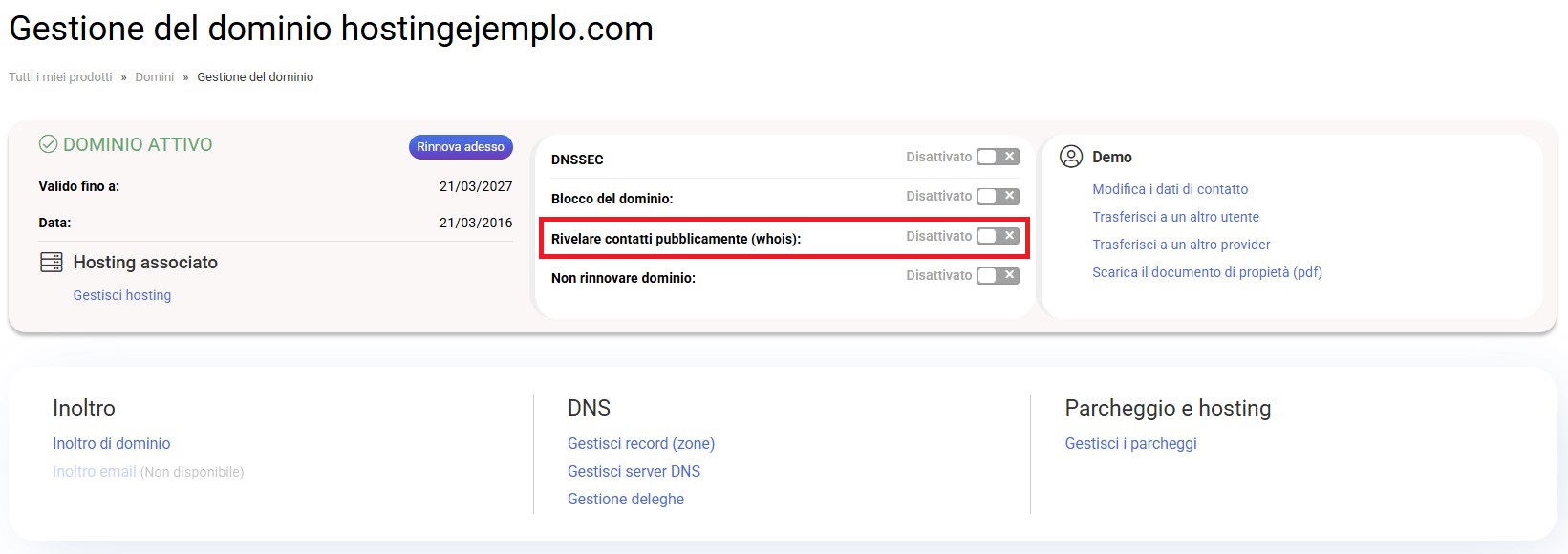 Una volta nella schermata Gestione dominio, sarai in grado di rendere pubblici i dati di registrazione del dominio attivando l'opzione Pubblicare i dati nel Whois.