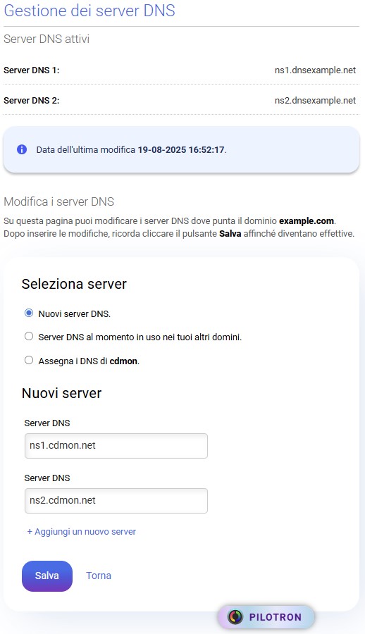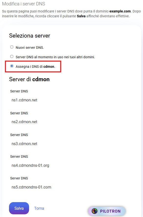 Puoi anche assegnare direttamente i server DNS di cdmon selezionando l’opzione Assegna i DNS di cdmon.