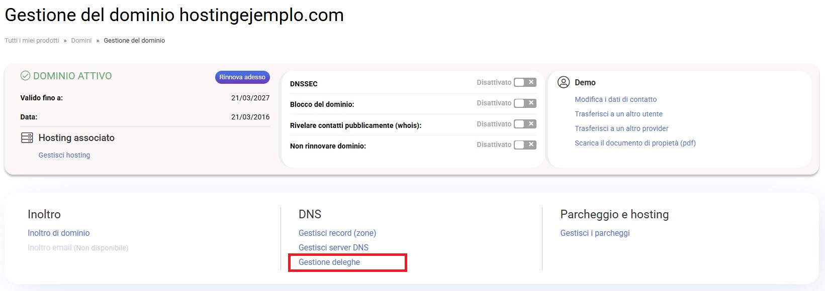 Nella schermata di gestione del dominio è necessario fare clic sull'opzione Gestire le delegazioni.