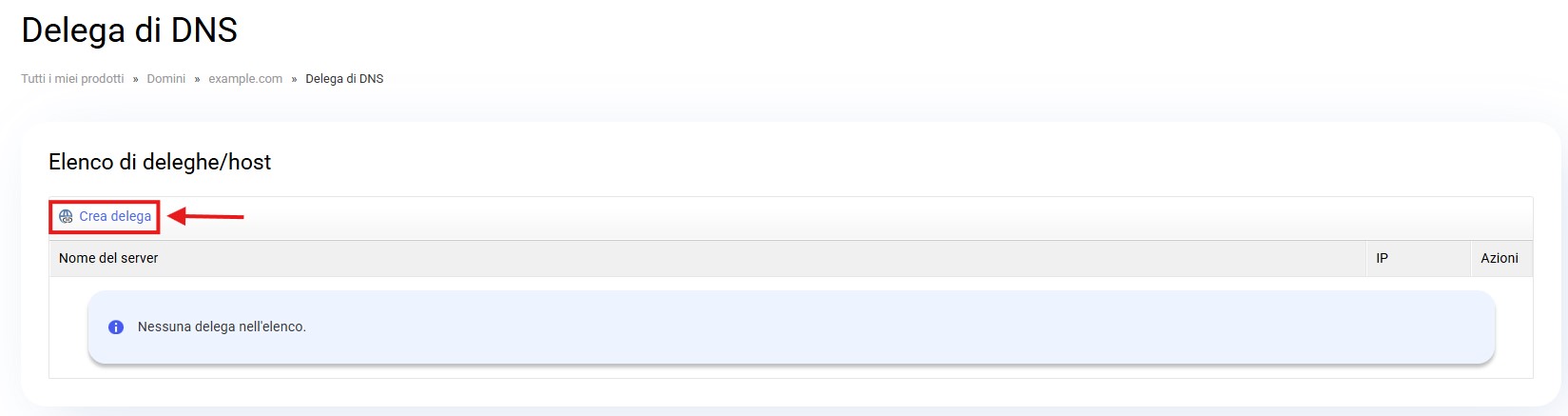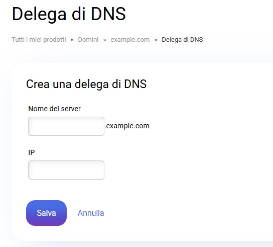 Nel modulo "Crea delegazione DNS" è possibile creare i sottodomini che verranno scaricati come record server DNS.