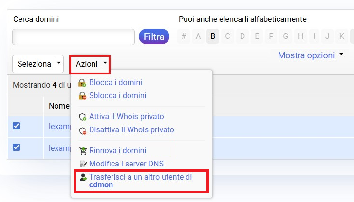 Successivamente, selezionate i domini che desiderate trasferire all’altro utente utilizzando le caselle a sinistra dell’Elenco domini registrati. Una volta selezionati, andate su Azioni e cliccate su Trasferire a un altro utente di cdmon come mostrato nell’immagine: