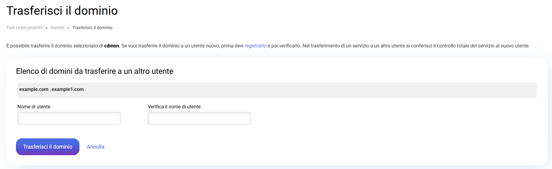 Nel passo successivo dovrete indicare il nome utente a cui desiderate trasferire i domini. Per evitare errori di digitazione, dovrete inserire il nome utente due volte.