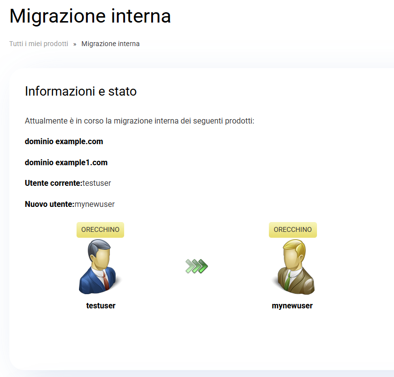 Cliccando su Accetta, accederete alla gestione della Migrazione interna. Da qui potete vedere i domini richiesti per il trasferimento al nuovo utente e anche lo stato per entrambi gli utenti, se è In attesa di accettazione o Accettato nel caso abbiano già confermato il trasferimento: