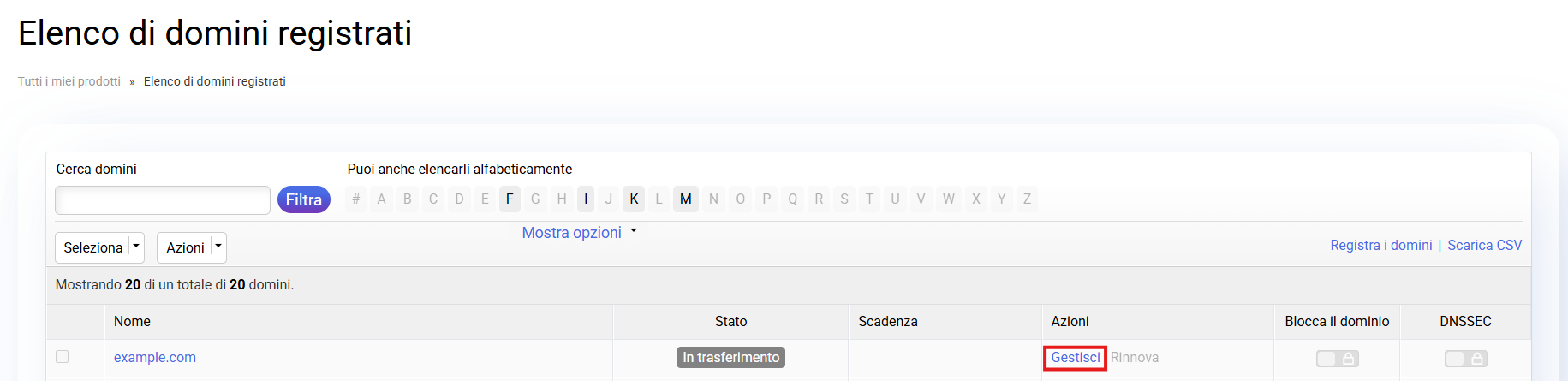 Al fine di facilitare la gestione del trasferimento e fornire maggiori informazioni sul loro stato, la dashboard ha una schermata per gestire il trasferimento di un dominio.