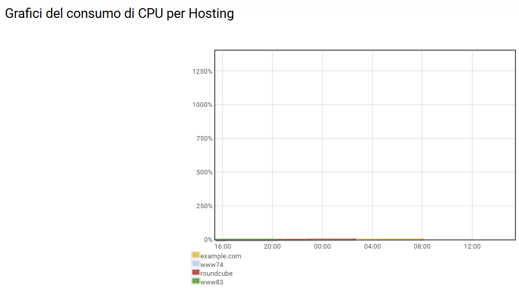 Il grafico mostra un elenco dei dieci hosting che consumano più CPU. L’asse orizzontale mostra l’uso della CPU per fascia oraria, mentre quello verticale mostra l’uso della CPU in %. In questo esempio, il server dispone di 4 core CPU, equivalenti a 400 sull’asse verticale.