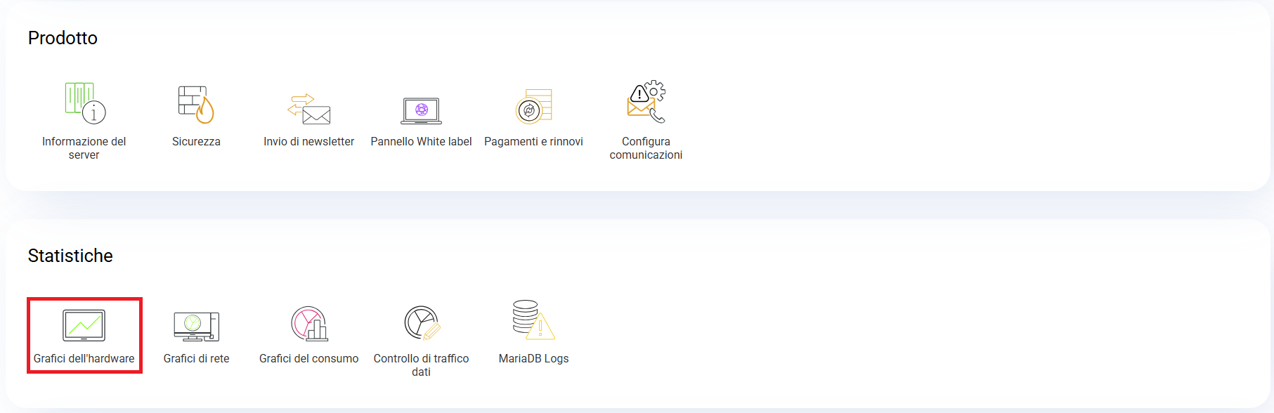 I grafici hardware ti permettono di visualizzare lo stato del tuo server. Per consultarli, accedi alla gestione del server dal tuo pannello di controllo di cdmon e fai clic sull’opzione Grafici del hardware. Nella sezione "Grafici hardware" puoi ...